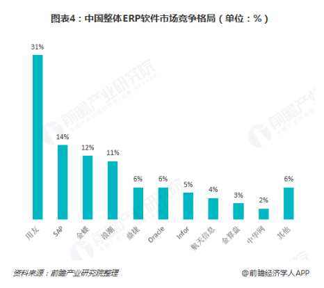 2018年前六大ERP廠商依次為用友網(wǎng)絡(luò)、SAP、金蝶國際、浪潮國際、鼎捷和Oracle,國內(nèi)ERP廠商各家市場份額均有明顯提升,分別為用友網(wǎng)絡(luò)31%、金蝶國際12%、浪潮國際11%和鼎捷6%,四家合計(jì)達(dá)60%。